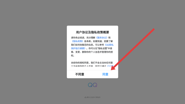1、通過(guò)點(diǎn)擊彈窗中的同意按鈕,同意用戶(hù)協(xié)議后進(jìn)入qq。