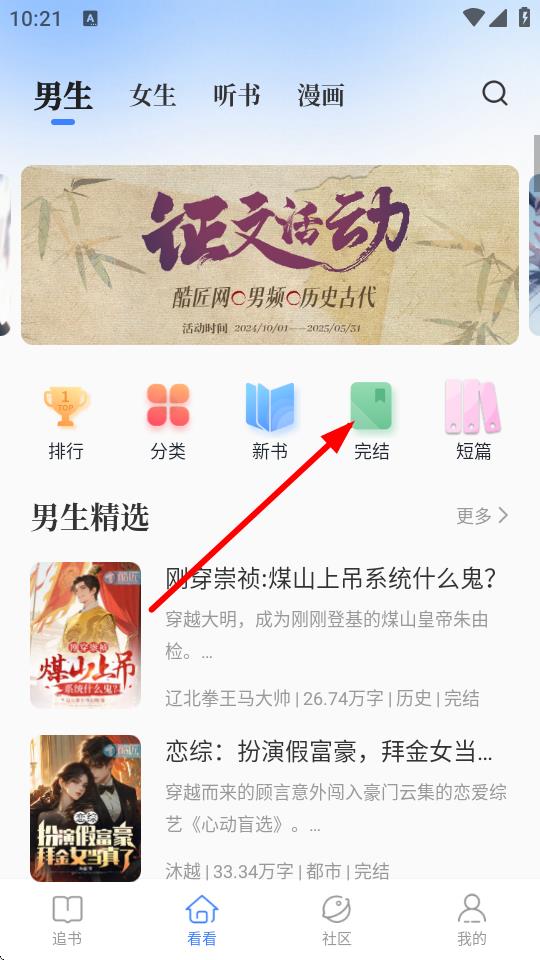 1、打開酷匠閱讀APP,在看看界面中,點(diǎn)擊上方導(dǎo)航欄里的完結(jié)選項(xiàng)。