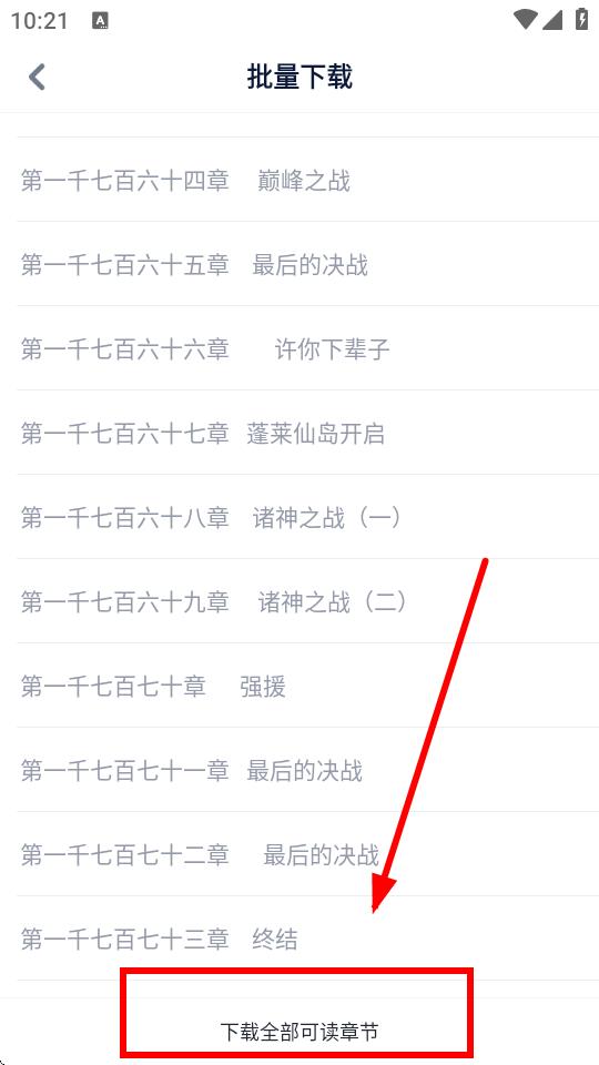 4、在批量下載界面中,點(diǎn)擊下載全部可讀章節(jié)按鈕,即可下載該小說。