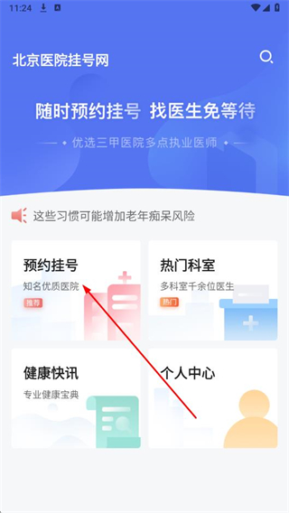 1、打開北京醫(yī)院掛號(hào)網(wǎng)APP,在首頁點(diǎn)擊預(yù)約掛號(hào)選項(xiàng)。