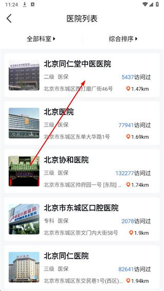 2、進(jìn)入醫(yī)院列表頁面,瀏覽并選擇你想掛號(hào)的醫(yī)院。