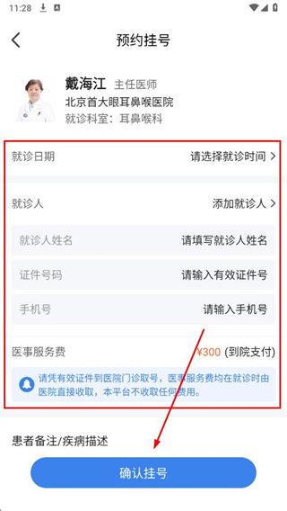 6、在“預(yù)約掛號(hào)”頁面,填寫就診日期、添加就診人信息,點(diǎn)擊確認(rèn)掛號(hào)。