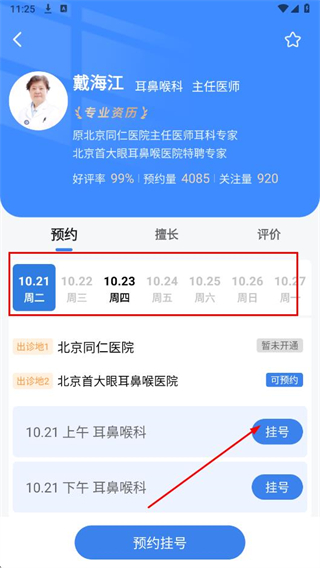 4、進(jìn)入醫(yī)生詳情頁面,在日期欄中選擇你方便就診的日期。