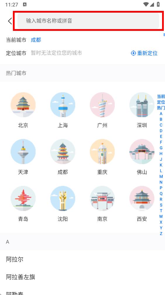 2、在城市選擇界面的搜索框中,輸入要切換的城市名稱或拼音。