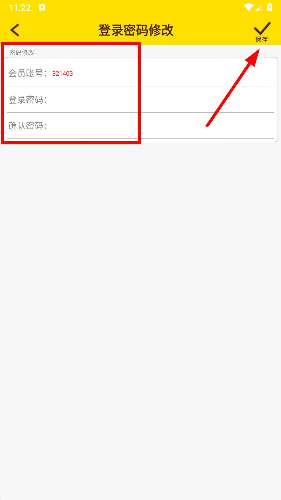 4、在密碼修改頁面,依次輸入會員賬號、新的登錄密碼以及確認(rèn)密碼,輸入完成后,點擊右上角保存,即可完成密碼修改。