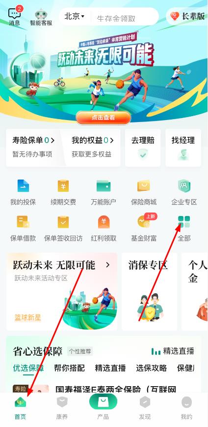 1、打開國壽隨行APP,點(diǎn)擊底部首頁,進(jìn)入應(yīng)用主界面,找到并點(diǎn)擊全部開啟保單借款操作第一步。