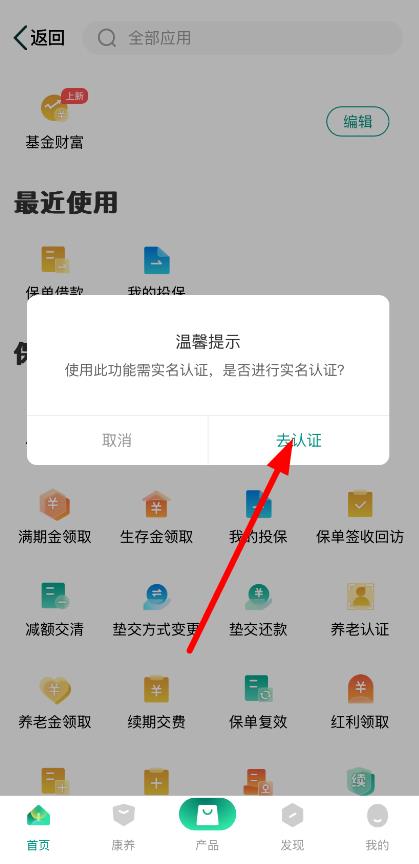 3、在功能頁,若需實(shí)名認(rèn)證,按提示點(diǎn)擊去認(rèn)證,完成認(rèn)證后即可申請(qǐng)保單借款。