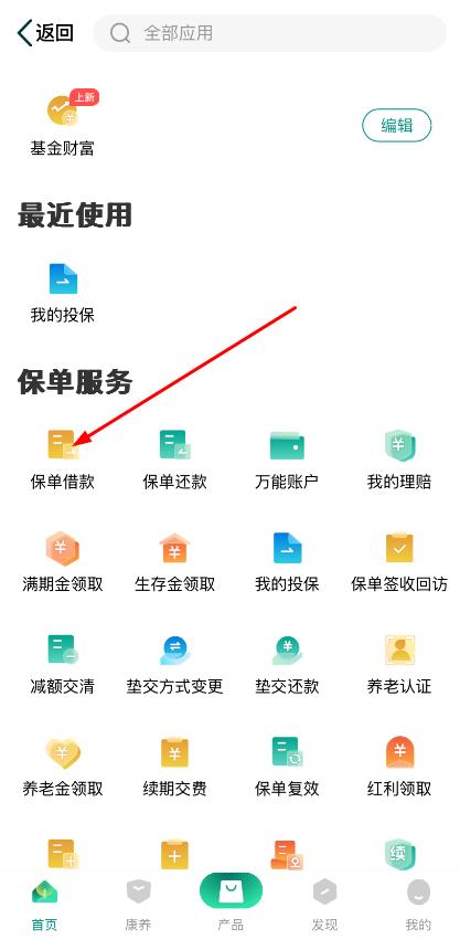 2、跟隨流程點(diǎn)擊保單借款,進(jìn)入應(yīng)用功能聚合頁,查找保單借款相關(guān)服務(wù)。