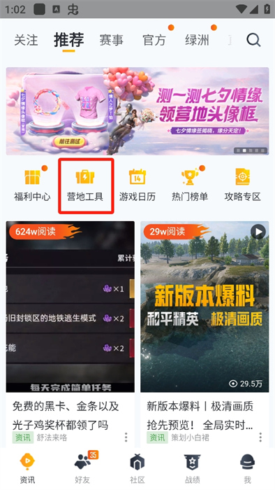 1、首先需要手機中有一個【和平營地】需要在和平營地中申請,打開和平營地,在其中點擊【營地工具】;