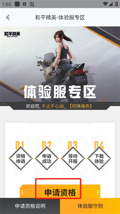 提示:想要申請測試資格,需要滿足申請資格,然后在【和平營地app-營地工具-體驗服申請】中去進行申請,網(wǎng)頁版暫時無法申請。