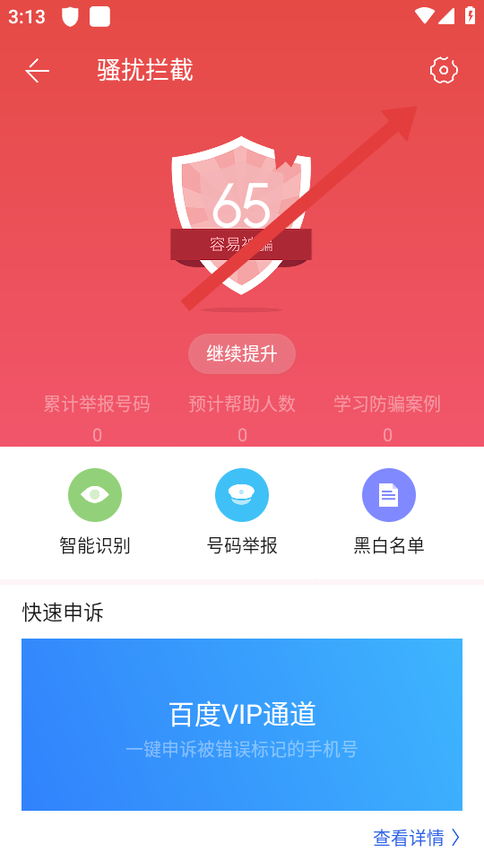 1、打開(kāi)百度手機(jī)衛(wèi)士APP,進(jìn)入騷擾攔截頁(yè)面,點(diǎn)擊右上角齒輪狀設(shè)置圖標(biāo),進(jìn)入騷擾攔截設(shè)置界面。