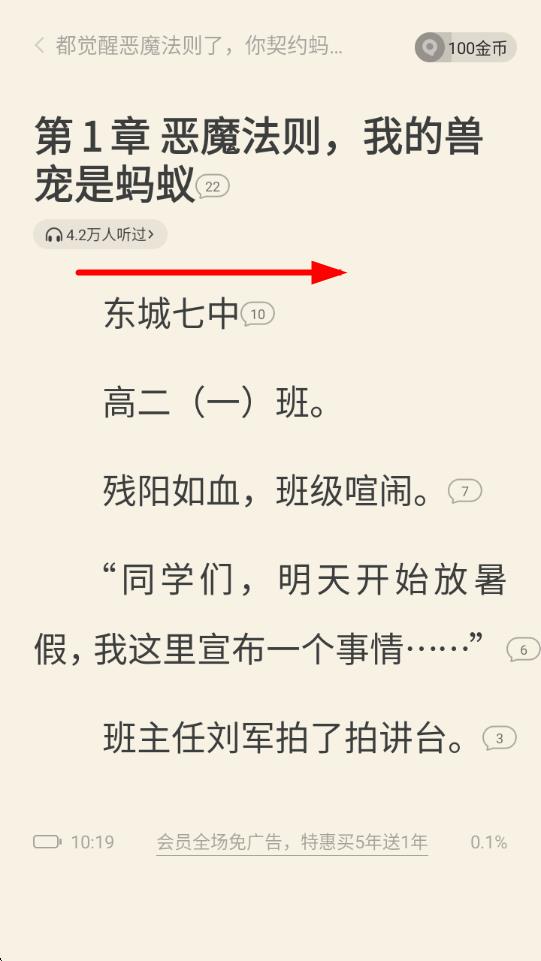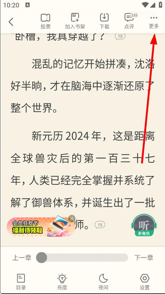 2、進(jìn)入蟲族天災(zāi)的閱讀頁面后,開始閱讀小說內(nèi)容,當(dāng)讀到想要標(biāo)記的位置時(shí),點(diǎn)擊屏幕上方的更多選項(xiàng),打開更多操作菜單。