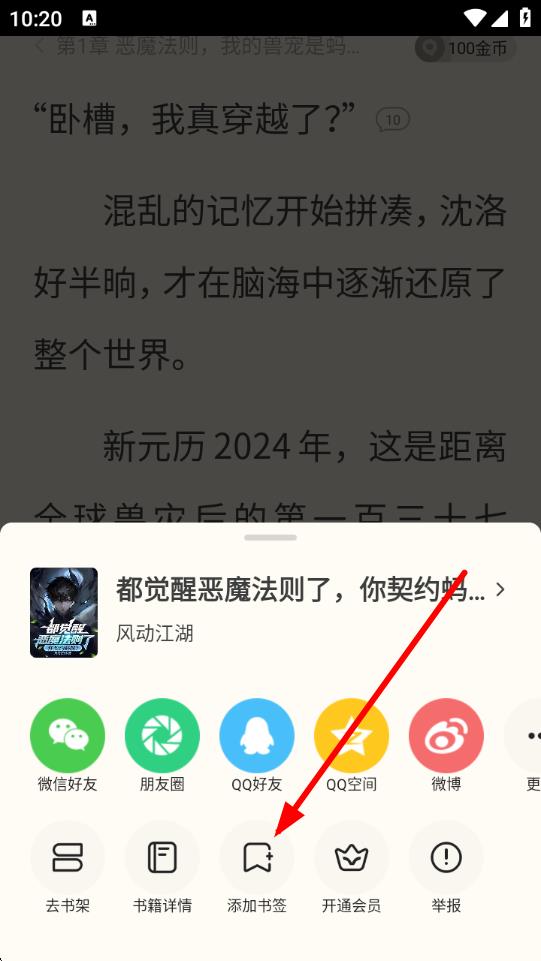 3、在彈出的操作菜單中,找到并點(diǎn)擊添加書簽按鈕,即可成功為當(dāng)前閱讀位置添加書簽,方便后續(xù)快速找到該章節(jié)繼續(xù)閱讀。