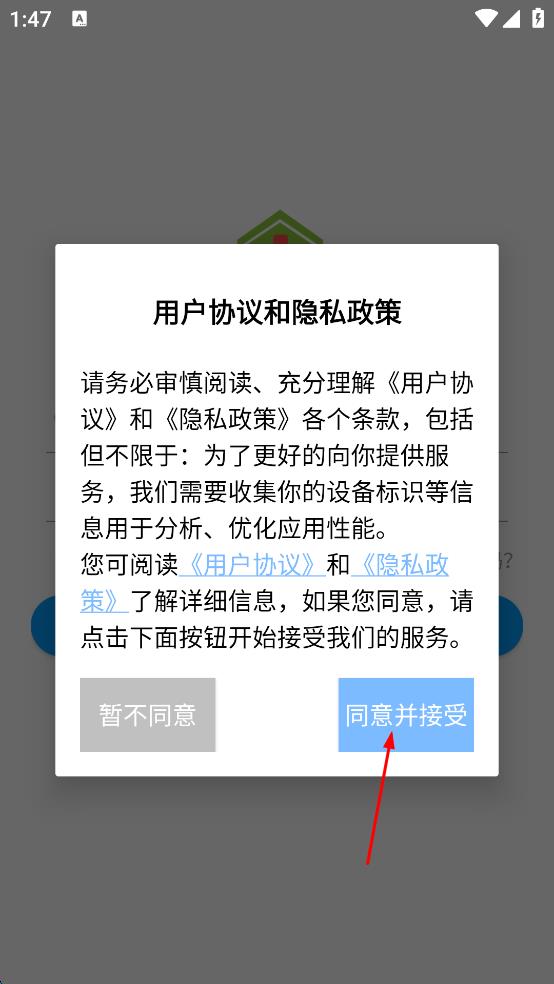 1、打開醫(yī)療類APP,會彈出用戶協議和隱私政策頁面,仔細閱讀后點擊同意并接受按鈕。
