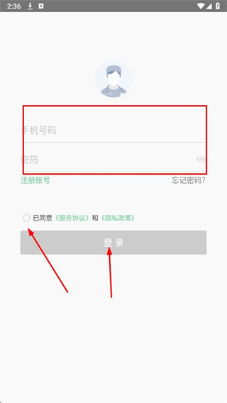 3、注冊完成后,返回登錄頁面,勾選協(xié)議,輸入手機號碼和密碼后,點擊登錄。