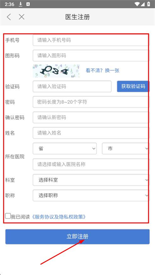 2、在醫(yī)生注冊頁面填寫信息,勾選協(xié)議后,點擊立即注冊。