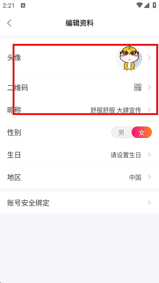 4、進(jìn)入編輯資料頁(yè)面,能對(duì)頭像、昵稱等個(gè)人資料進(jìn)行修改設(shè)置。
