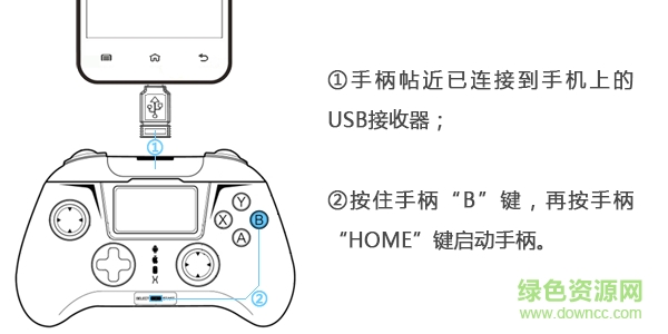 B、手機(jī)和USB無(wú)線接收器連接之后,將手柄帖近接收器(盡量減少其他信號(hào)干擾)按住手柄的“A”鍵,再按手柄的“HOME”鍵啟動(dòng)手柄進(jìn)行連接(與藍(lán)牙的連接啟動(dòng)方式一致)。