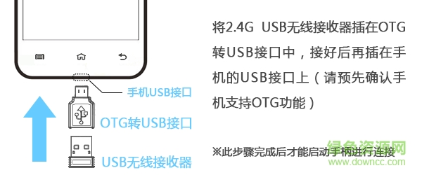 A、將2.4GUSB無(wú)線接收器和OTG轉(zhuǎn)USB接口連接上,然后將OTG轉(zhuǎn)換接口的另一端和手機(jī)的USB接口連接(可根據(jù)自己設(shè)備的USB接口大小的情況選擇是否使用OTG轉(zhuǎn)換接口,前提是設(shè)備必須支持OTG功能);