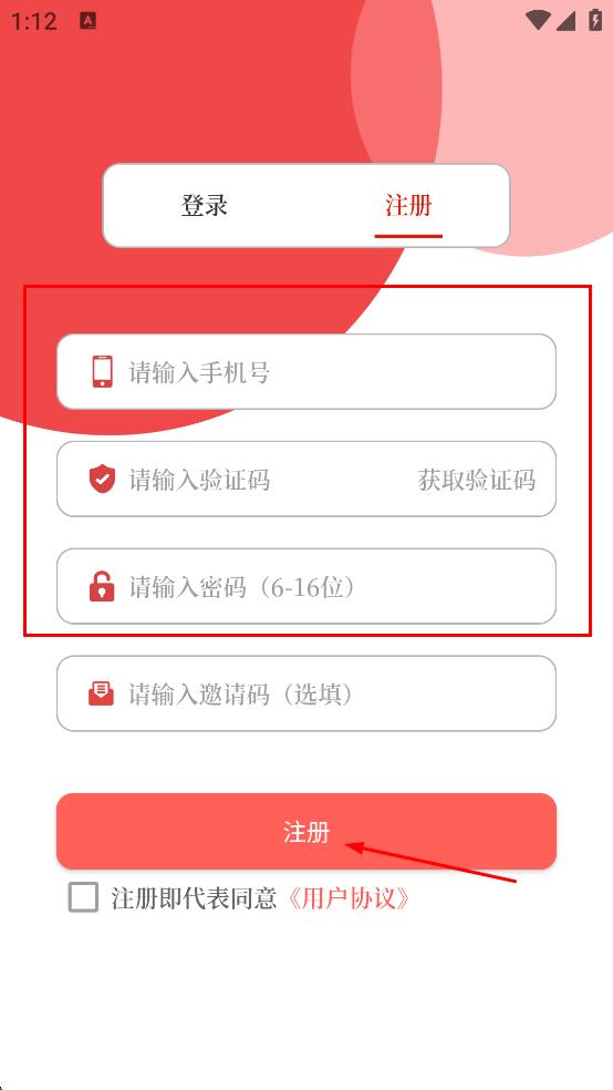 4、依次輸入手機號、獲取并輸入驗證碼,設密碼,邀請碼為選填項,勾選注冊即代表同意用戶協(xié)議選項,然后點擊“注冊”按鈕,完成注冊。