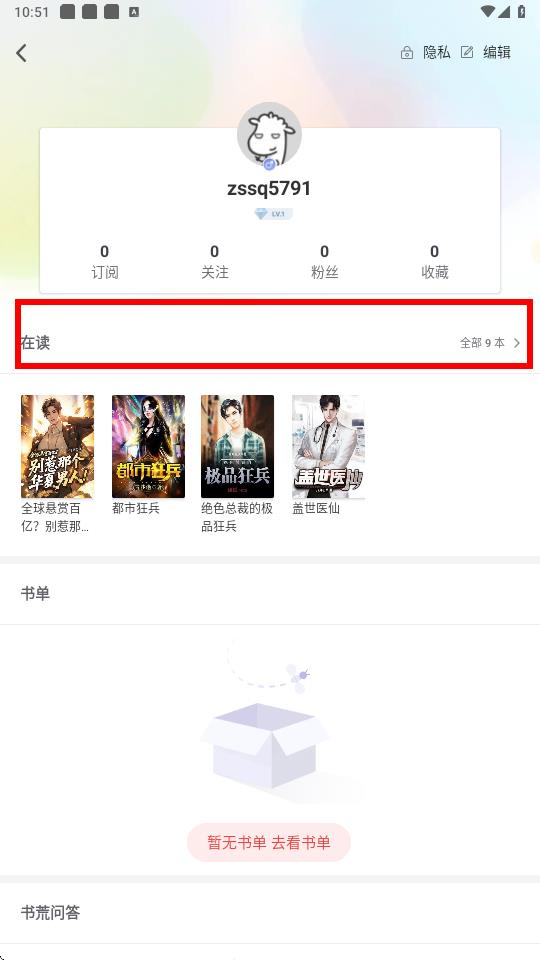 3、在個人資料界面中找到在讀板塊,點擊全部即可查看