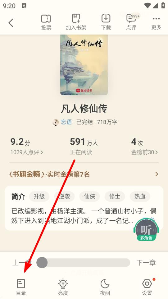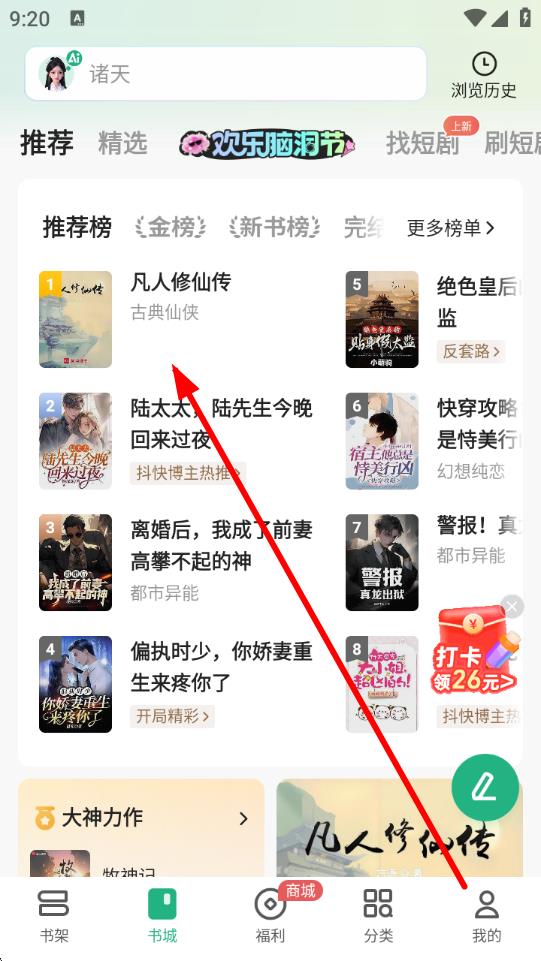 1、打開書旗小說APP,在書城的推薦榜等榜單中,選擇想要閱讀的小說,比如凡人修仙傳,點擊進入小說界面。