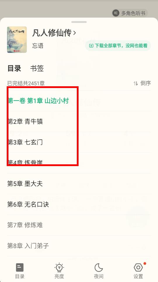 3、點擊后會彈出小說的目錄頁面,在這個頁面能看到小說的總章節(jié)數(shù),以及具體的章節(jié)列表,方便快速選擇要閱讀的章節(jié)。