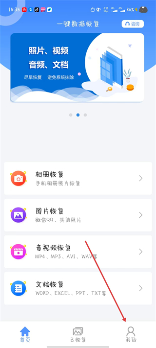 1、打開(kāi)一鍵數(shù)據(jù)恢復(fù)應(yīng)用,點(diǎn)擊右下角我的。