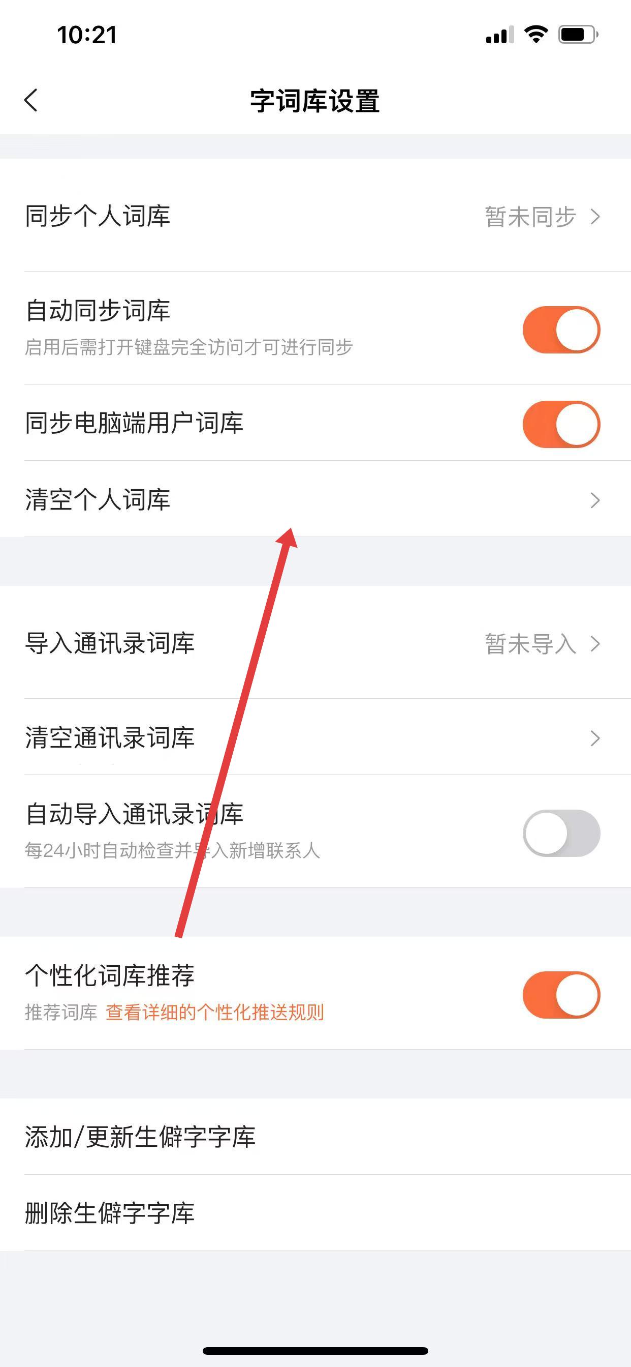 2、在字詞庫設(shè)置界面中,找到清空個(gè)人詞庫選項(xiàng)并點(diǎn)擊。