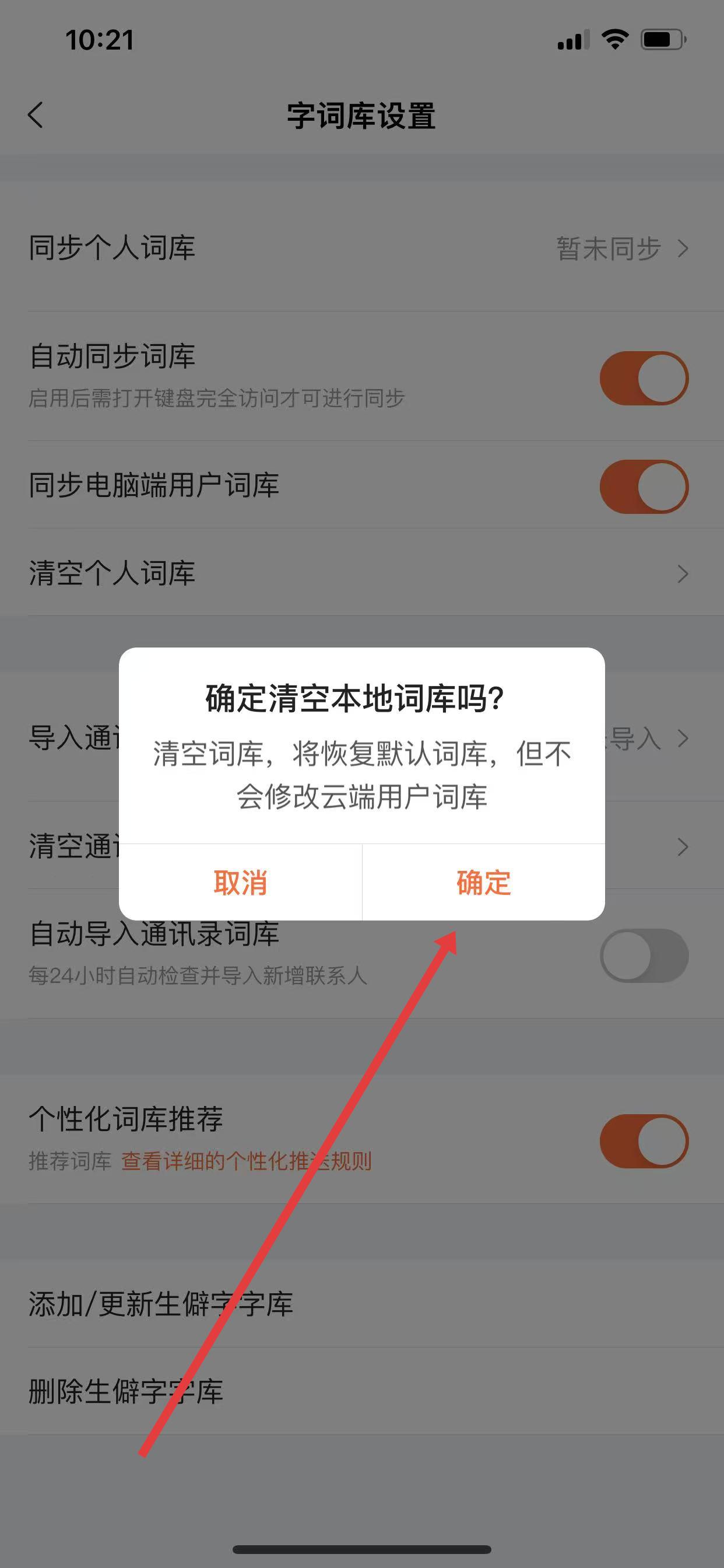 4、此時(shí)會(huì)彈出確認(rèn)提示框,詢問確定清空本地詞庫嗎,點(diǎn)擊確定,即可清空本地的記憶詞匯。