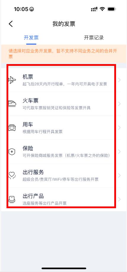 3、進(jìn)入我的發(fā)票頁面后,選擇需要開具發(fā)票的業(yè)務(wù)類型,如機(jī)票、火車票、用車等。