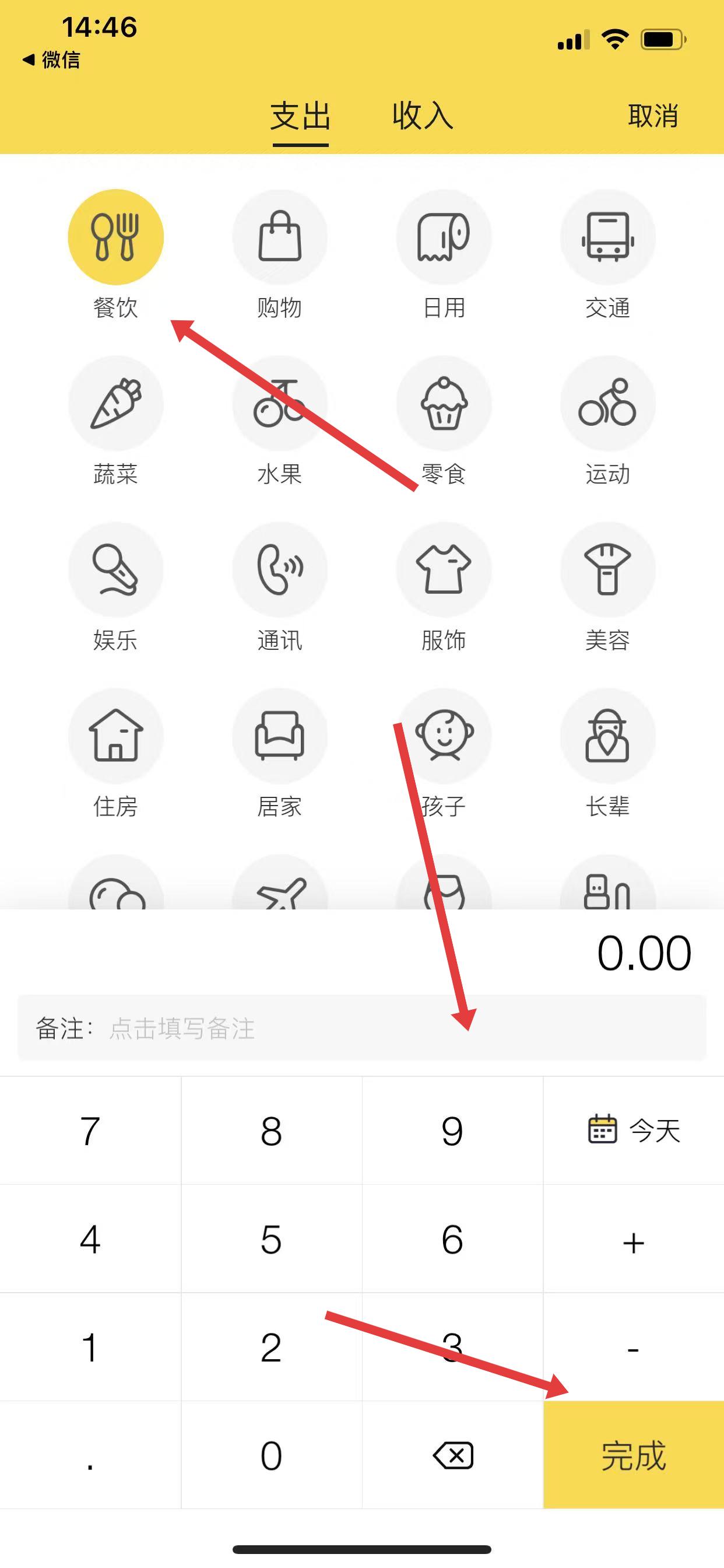 2、在支出或收入標(biāo)簽下,選對應(yīng)類目,輸入金額,點(diǎn)擊完成。