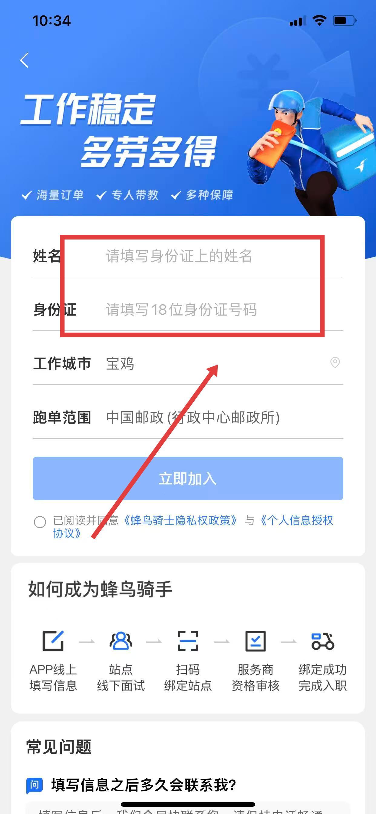 1、在蜂鳥騎士注冊界面,填寫身份證上的真實姓名和18位身份證號碼,點擊工作城市。