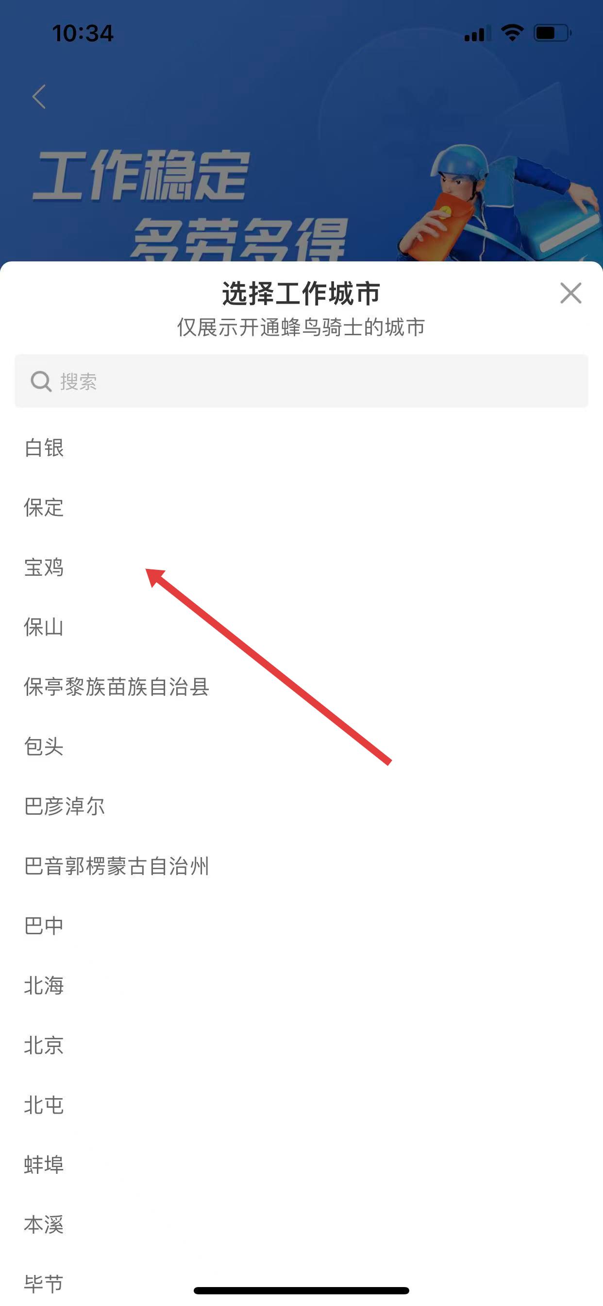 2、在彈出的城市列表中選擇意向工作城市,如寶雞。