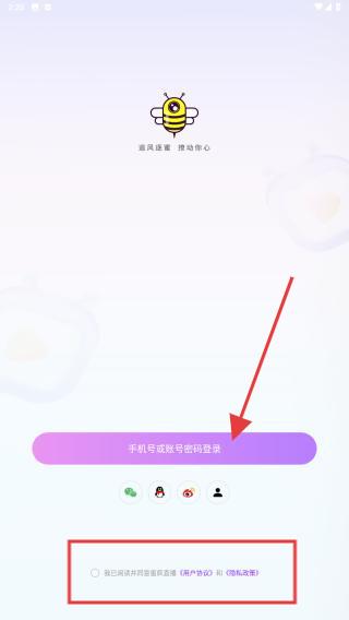 1、打開蜜瘋直播手機(jī)APP,進(jìn)入軟件,需點(diǎn)擊手機(jī)號或賬號密碼登錄的按鈕。