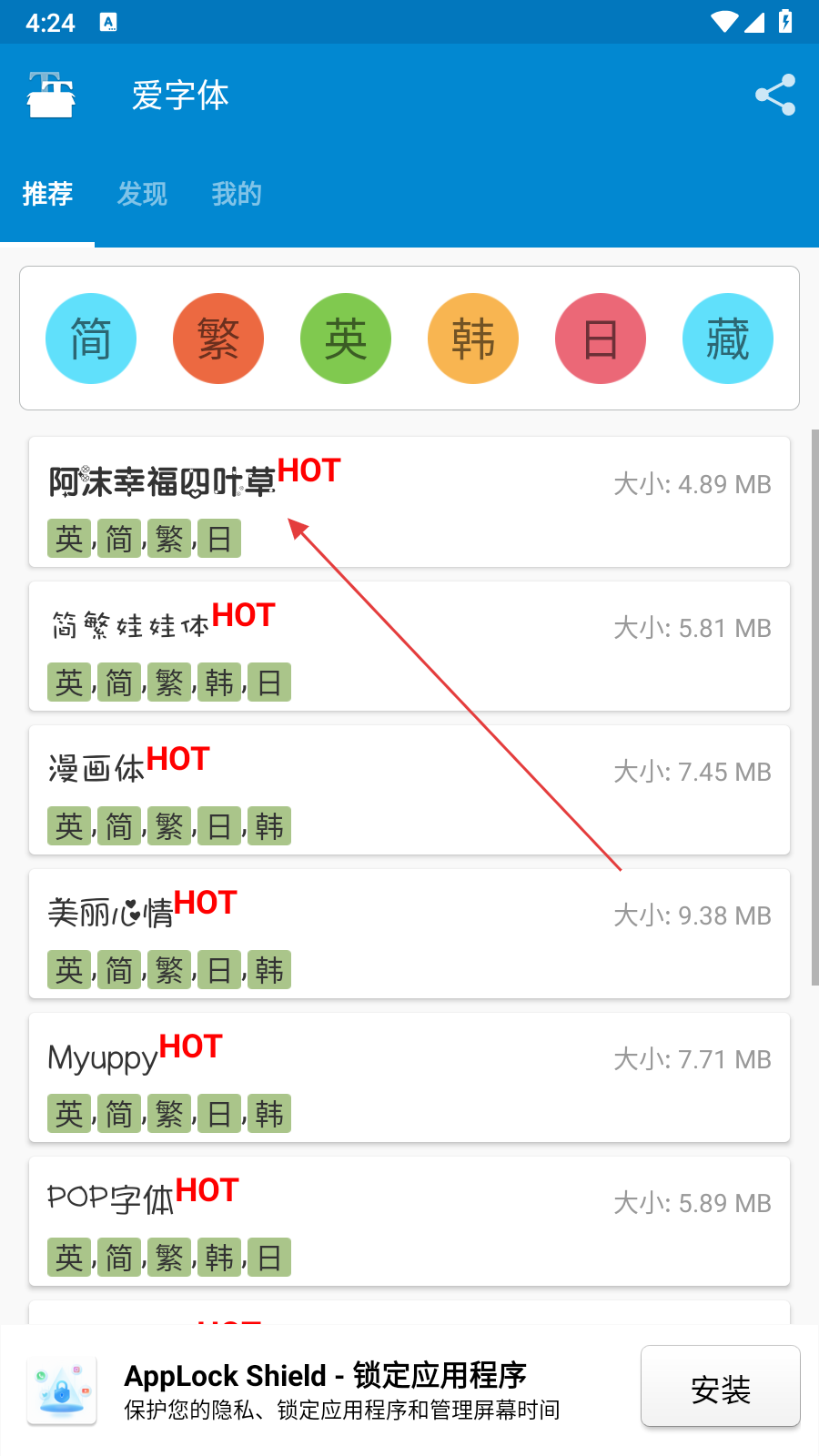 1、打開(kāi)愛(ài)字體應(yīng)用,在推薦頁(yè)面中瀏覽并選擇想要使用的字體,點(diǎn)擊該字體進(jìn)入字體預(yù)覽頁(yè)面。