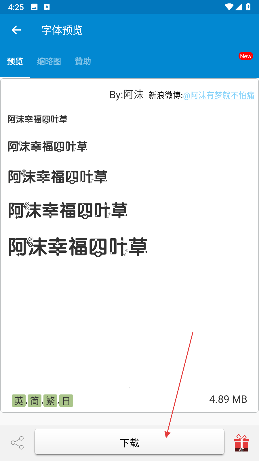 2、在字體預(yù)覽頁(yè)面中,點(diǎn)擊底部下載按鈕,等待字體下載完成。