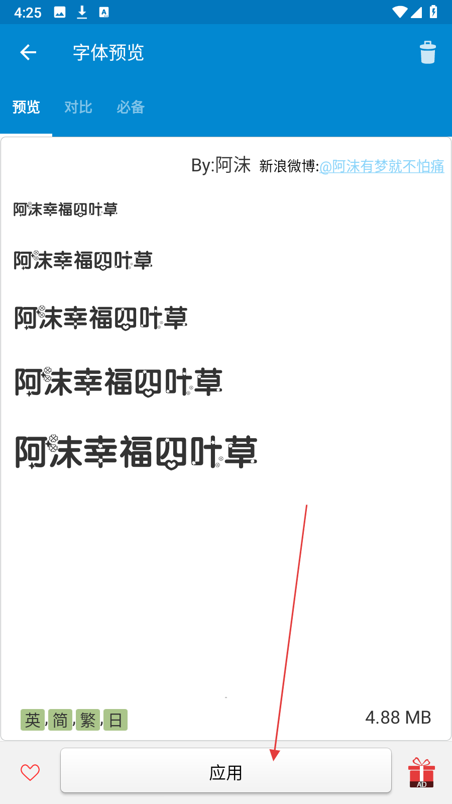 3、字體下載完成后,點(diǎn)擊底部應(yīng)用按鈕,按照提示完成字體的應(yīng)用設(shè)置,即可在支持字體更換的應(yīng)用中使用該字體。