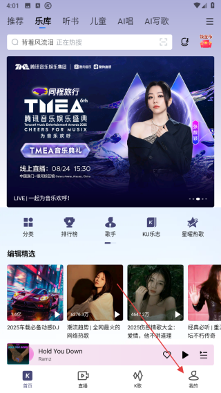 1、打開酷狗音樂(lè)APP,點(diǎn)擊底部導(dǎo)航欄中的我的進(jìn)入個(gè)人頁(yè)面。