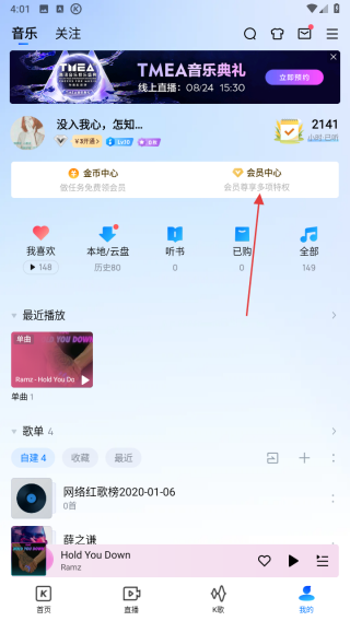 2、在個(gè)人頁(yè)面中,按照紅箭頭指示找到并點(diǎn)擊會(huì)員中心選項(xiàng)。