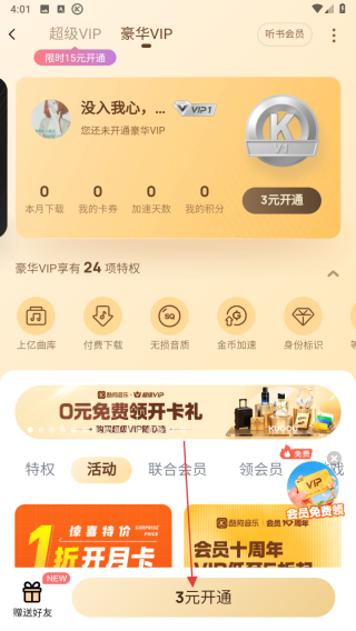 3、進(jìn)入會(huì)員中心后,選擇豪華VIP或其他會(huì)員類型,點(diǎn)擊下方3元開通按鈕,即可開通一個(gè)月的會(huì)員。