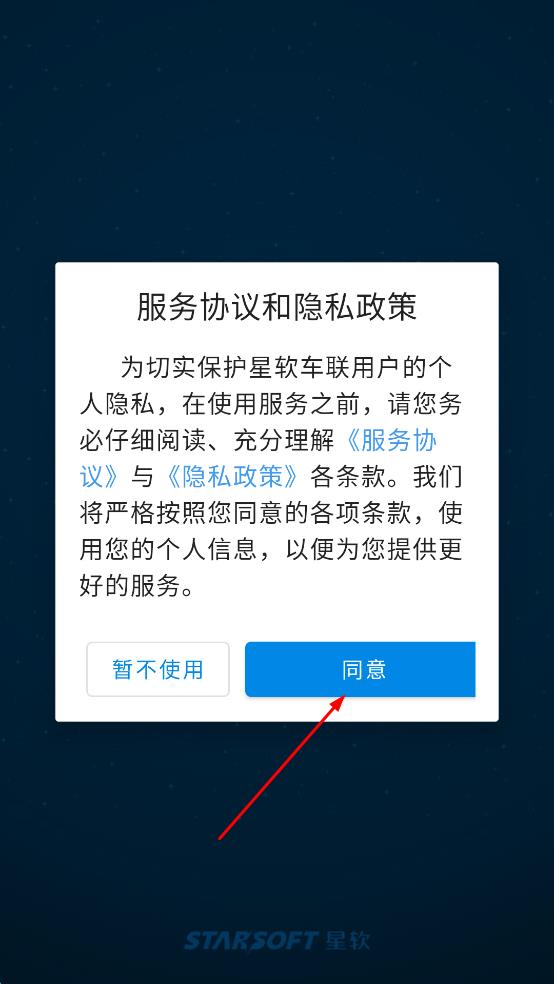 1、打開星軟車聯(lián)App,彈出“服務(wù)協(xié)議和隱私政策”提示框,仔細(xì)閱讀后點擊“同意”,進(jìn)入到應(yīng)用介紹頁面。