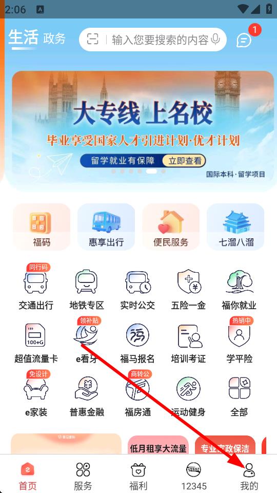 1、在e福州APP首頁,點(diǎn)擊底部我的選項(xiàng)進(jìn)入個(gè)人中心頁面。