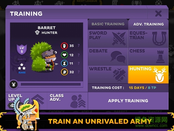 王國聯(lián)盟是一款模擬戰(zhàn)爭策略游戲“戰(zhàn)國同盟”的續(xù)作。在經(jīng)過數(shù)月的戰(zhàn)斗,一個名為溫特尼的戰(zhàn)士終于脫穎而出,登上了王位,他治國有方,使Kurestal王國走上了和諧發(fā)展的道路??稍谝粋€風雨交加的夜晚,他遭遇了暗殺,很快黑暗武士克萊格奪取了政權(quán),并詔告天下,重選近衛(wèi)武士團。在游戲中,玩家可從鄉(xiāng)村、森林、山區(qū)和城市這四個地方招募戰(zhàn)士、武士、箭手、魔法師等兵種,將其納入自己的軍隊里。利用空閑的時間訓練他們的武力、生命力、智力以及敏捷度,提升他們的等級,讓他們參加各種各樣的的戰(zhàn)役,完成各項冒險任務。當自己的士兵提升到Lv5或者Lv10等級,玩家可根據(jù)自己的喜好,讓士兵轉(zhuǎn)職,其他等級,例如Lv6,則不可以進行轉(zhuǎn)職。點擊進入某一個Lv5或者Lv10的士兵,點擊“CLASS ADV.”進入轉(zhuǎn)職界面,選擇右側(cè)其中一種職業(yè),便可成功轉(zhuǎn)職。
