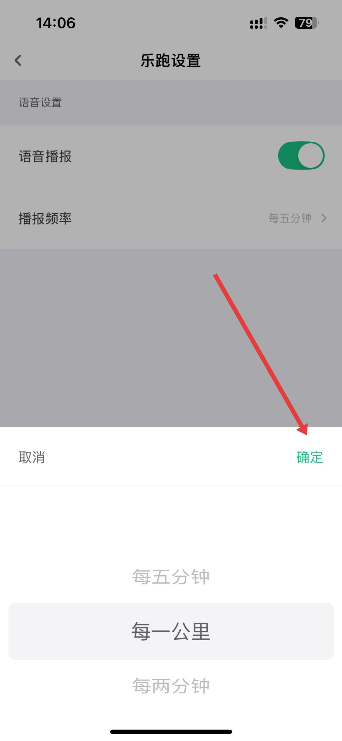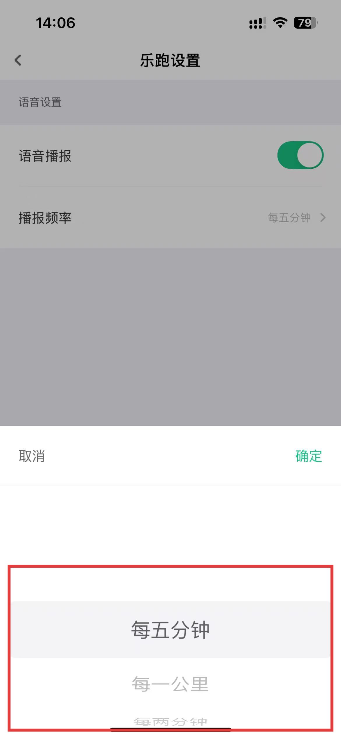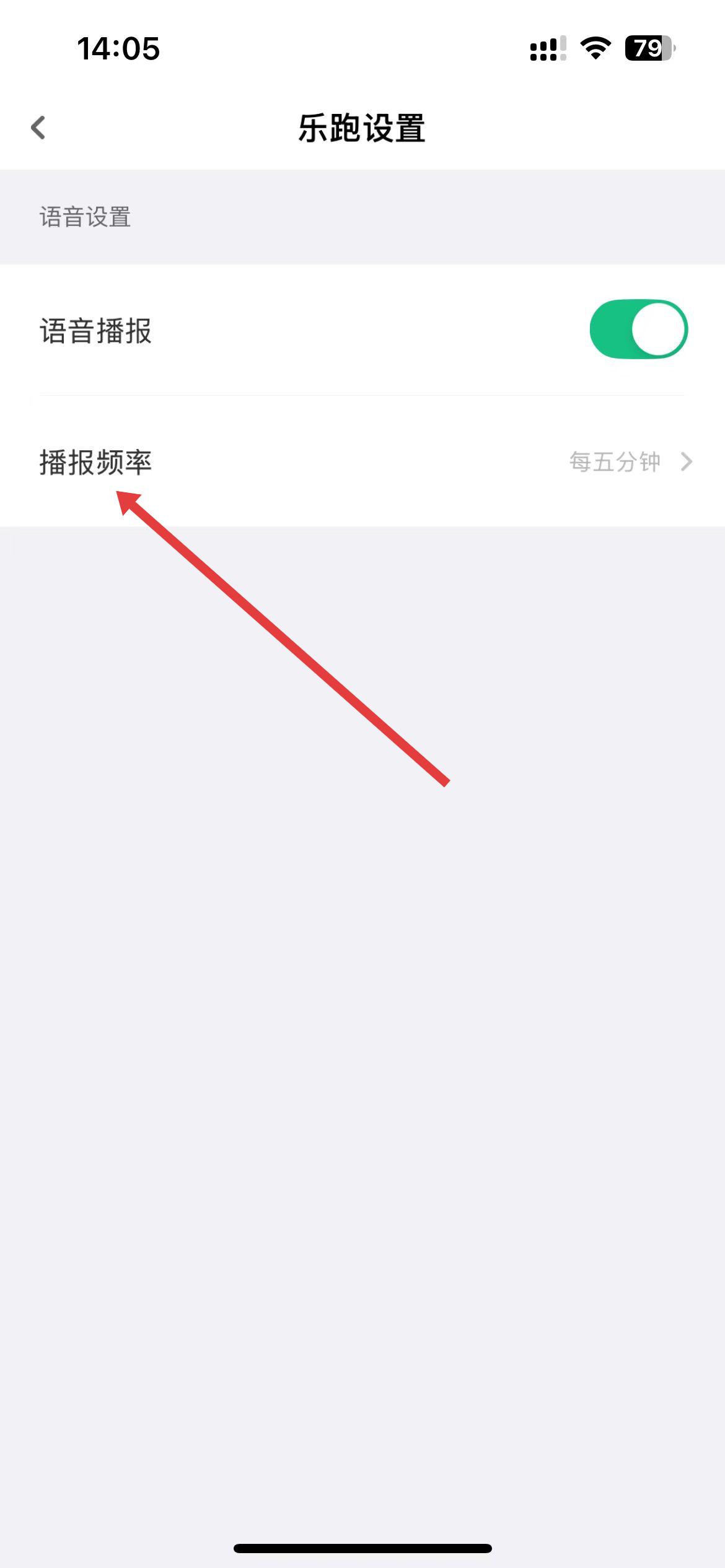 2、在樂(lè)跑設(shè)置頁(yè)面里,找到播報(bào)頻率選項(xiàng)并點(diǎn)擊,會(huì)彈出頻率選擇列表。