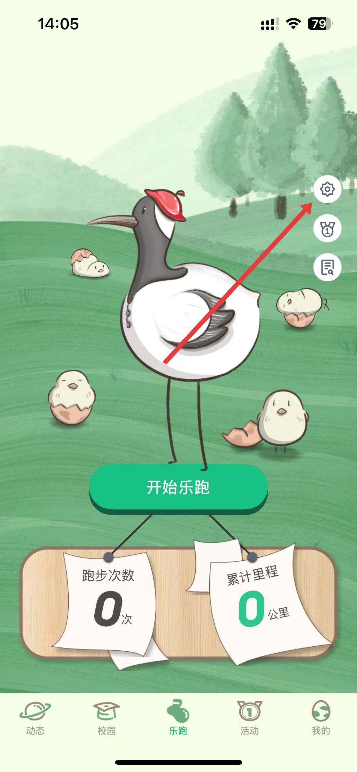 1、打開(kāi)步道樂(lè)跑app,在樂(lè)跑主界面中,點(diǎn)擊右上角的設(shè)置圖標(biāo),進(jìn)入樂(lè)跑設(shè)置頁(yè)面。