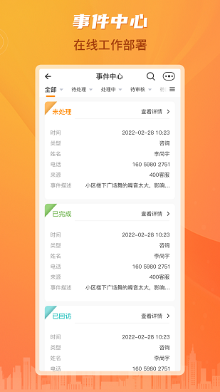 業(yè)主端App和400電話撥打的方式進行事件錄入,事件類型分為咨詢、建議、投訴、報修四類,事件中心狀態(tài)分為待處理、處理中、已完成、待回訪,查詢情況需要進行轉(zhuǎn)工單處理、電話回訪、信息回復(fù)業(yè)主。