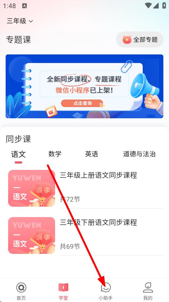 1、打開七天學(xué)堂應(yīng)用,點擊底部導(dǎo)航欄中的小助手切換界面。