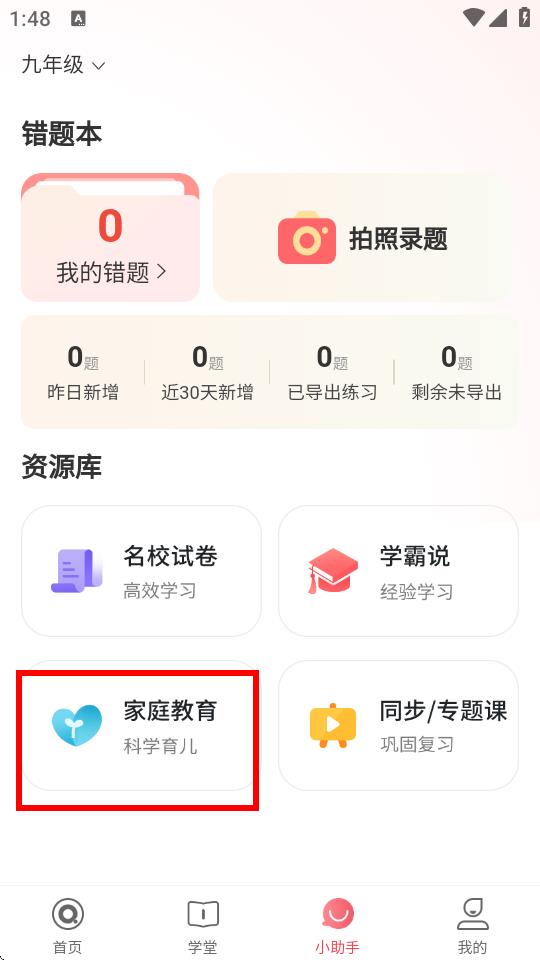 2、在新界面的資源庫板塊里,找到家庭教育選項并點擊進入。