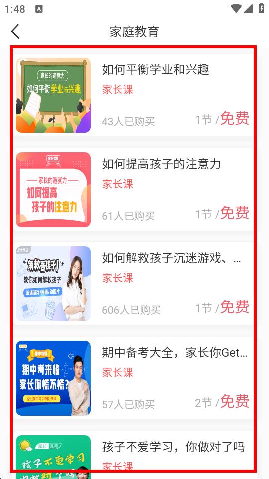 3、進入家庭教育頁面后,可看到眾多家長課程,如何平衡學(xué)業(yè)和興趣等,點擊感興趣課程即可學(xué)習(xí)。